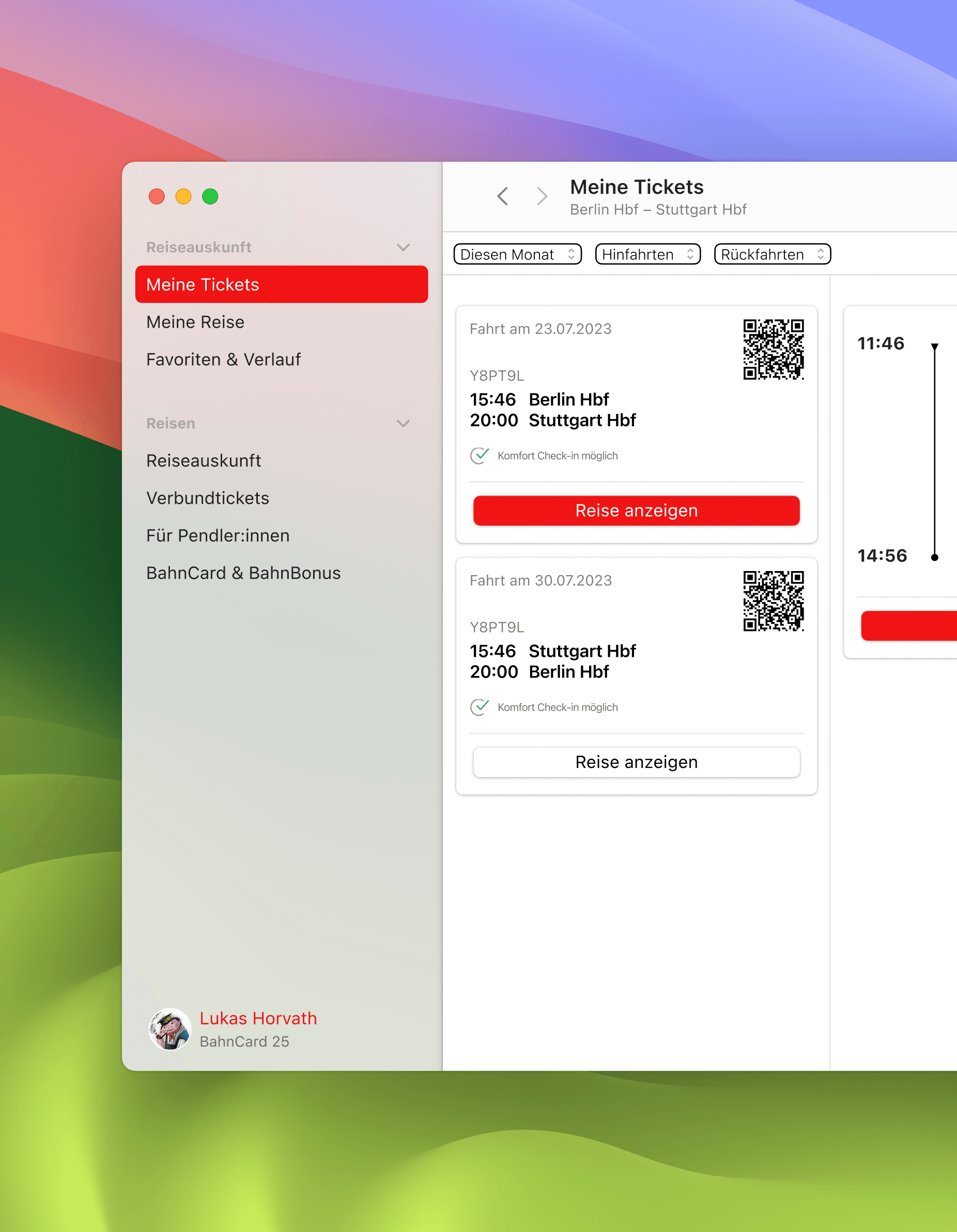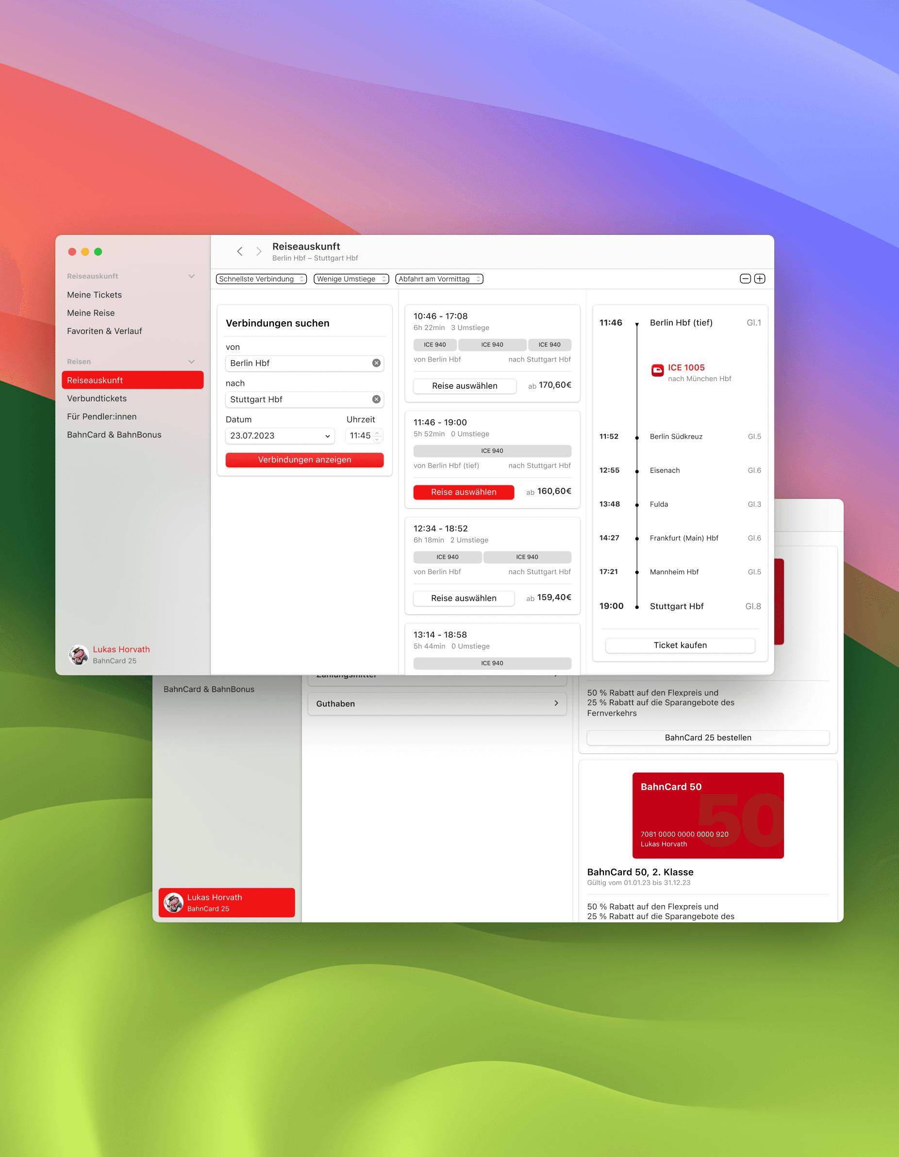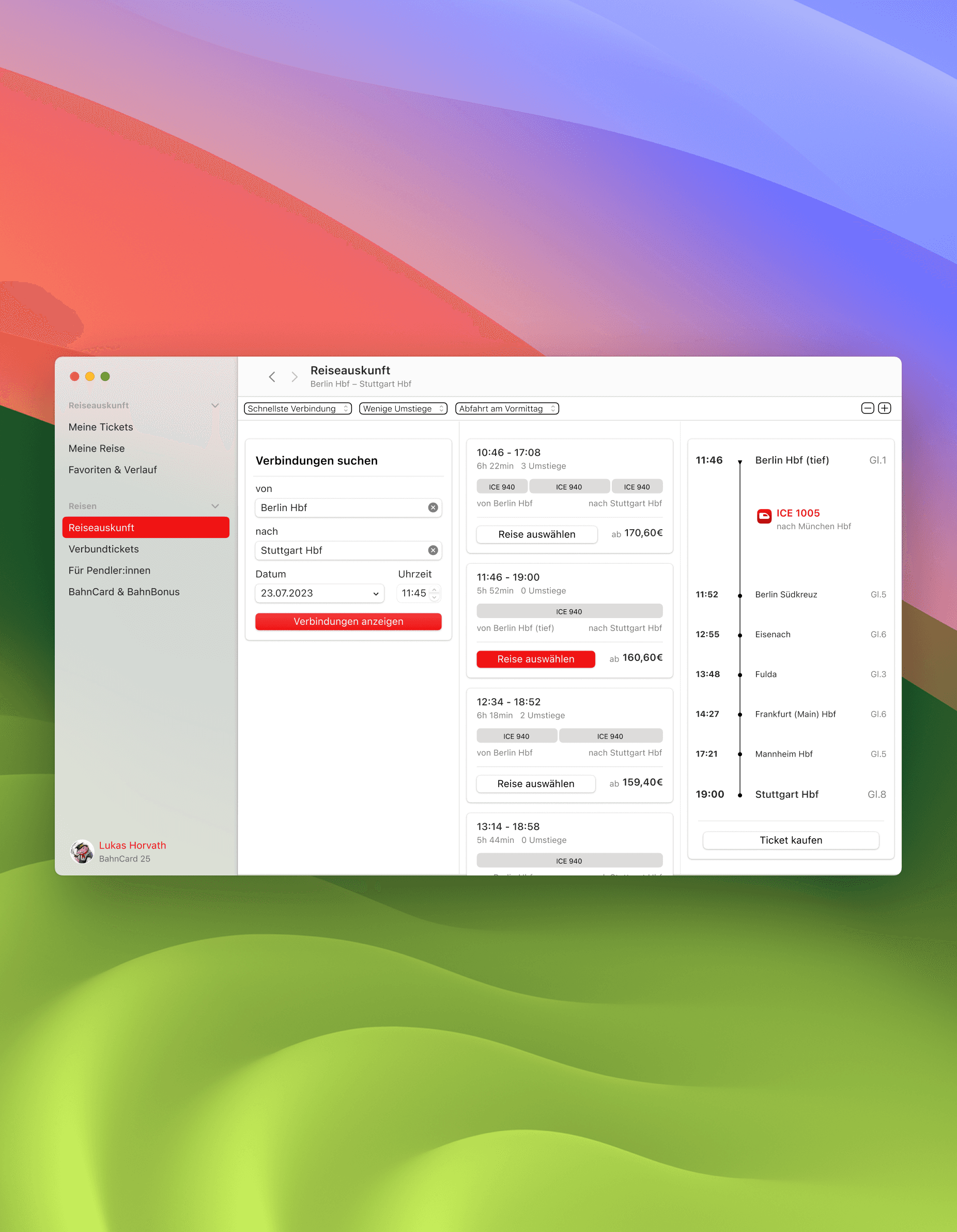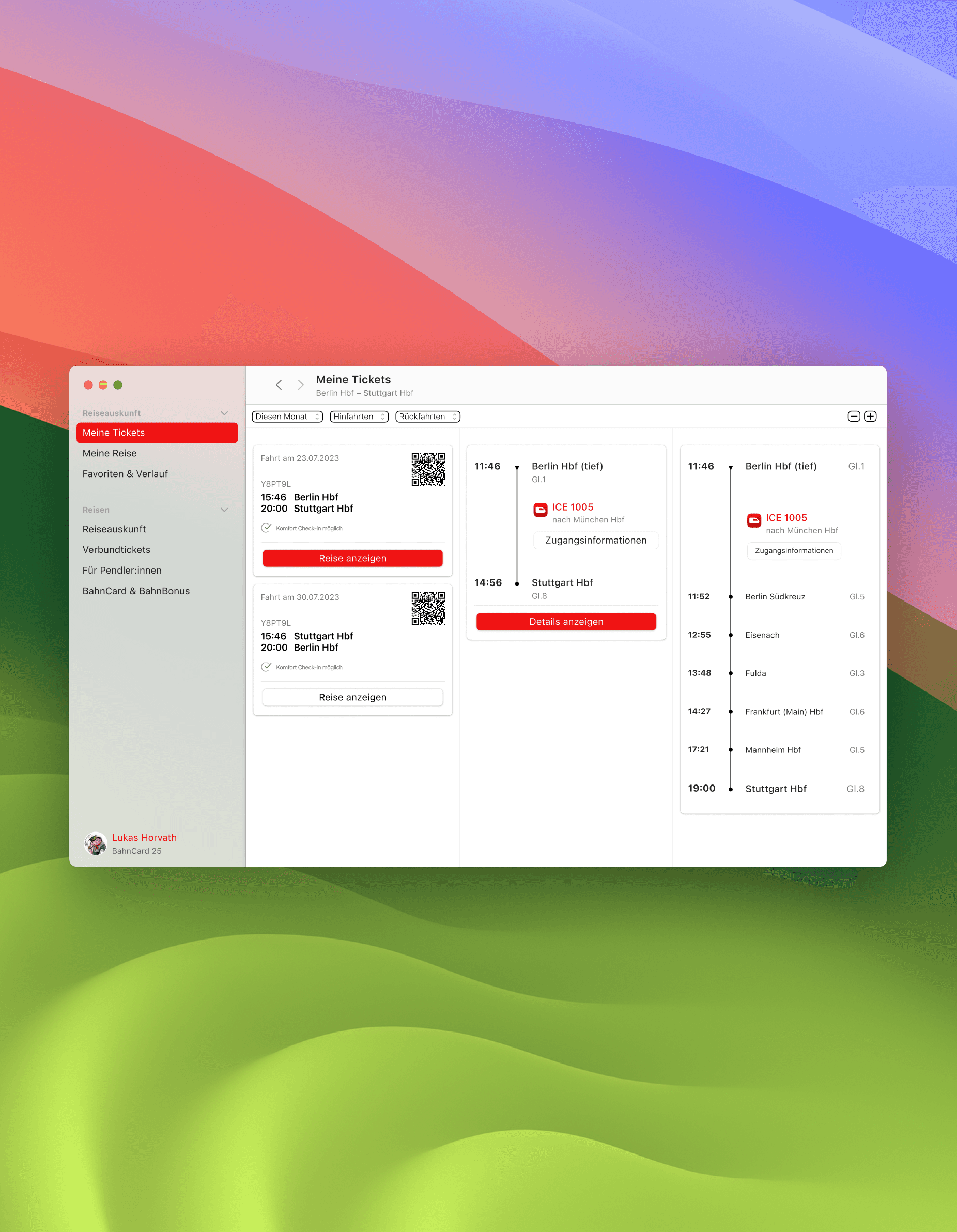 DB Navigator packs a lot into one app. Connection search, live updates, tickets, seat reservations, BahnCard, profile. The task for this student project was to take all of that and rebuild it as a native macOS app. Not just port the screens, but actually think through what changes when you move from a phone to a desktop. The interaction logic is different. The screen space is different. The way people sit and use the two devices is different. That gap between mobile and desktop is what this project is about.