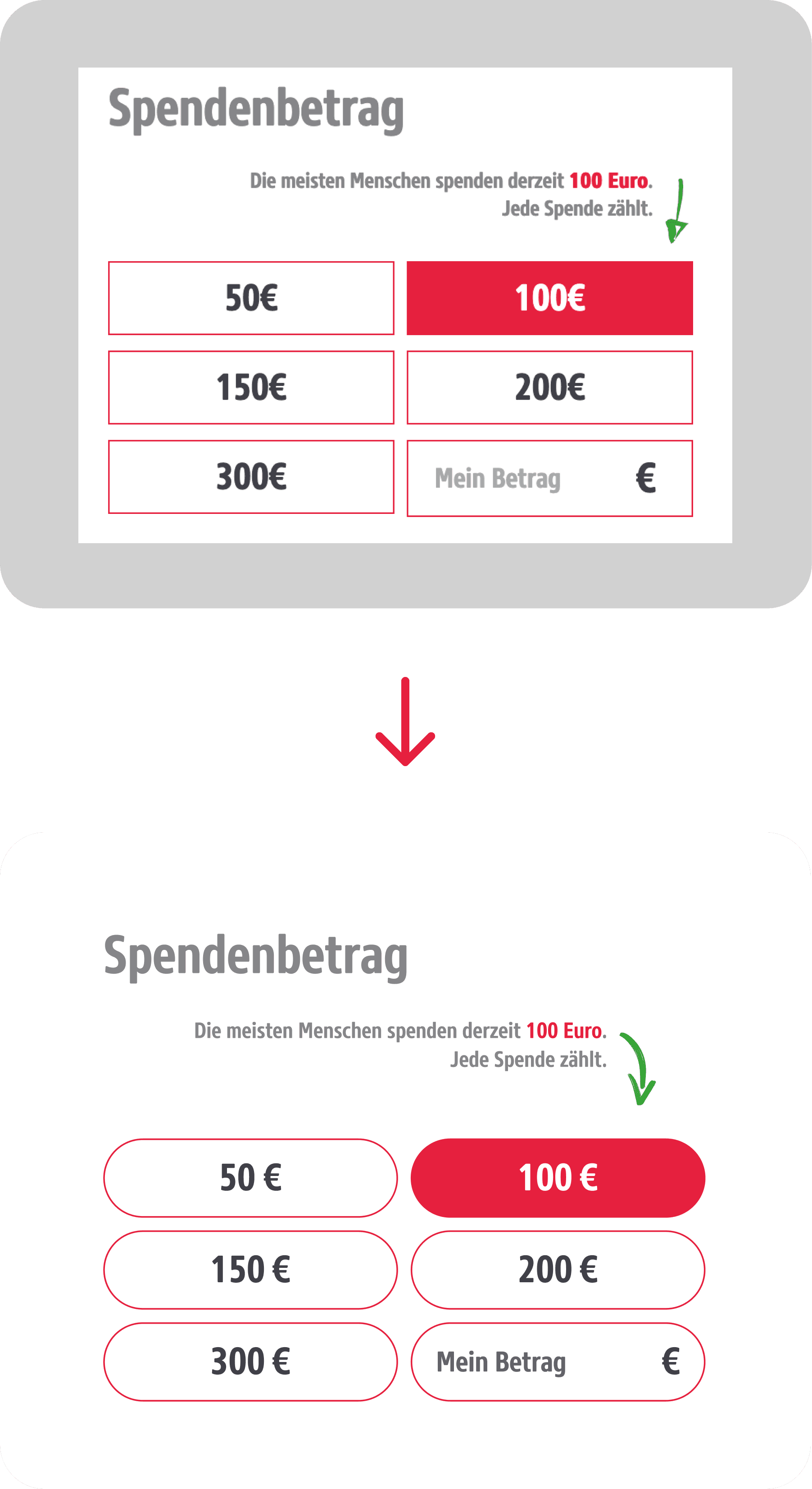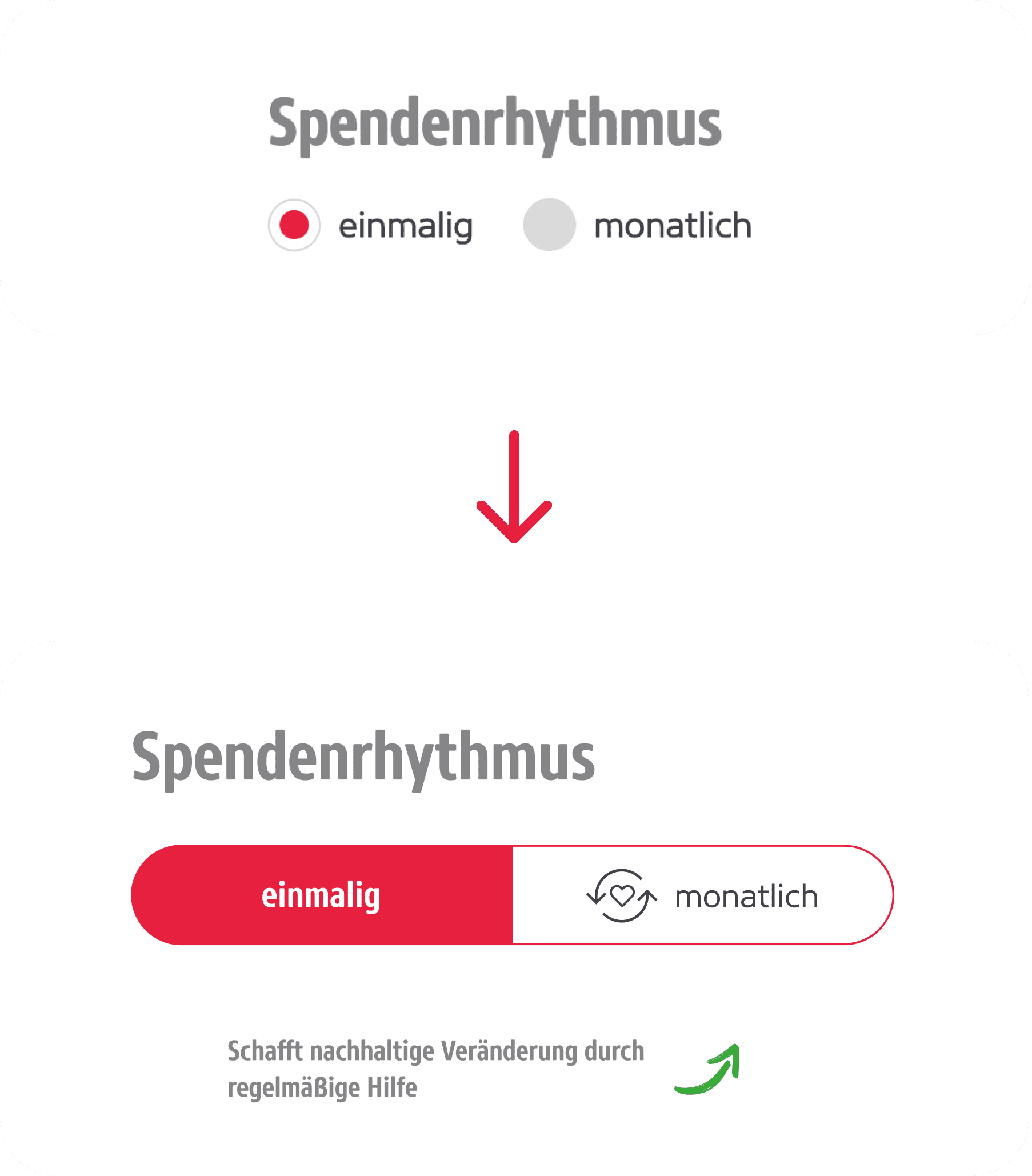 I replaced the radio buttons with an animated toggle. The monthly option gets a red active state, a short supporting label ("Schafft nachhaltige Veränderung durch regelmäßige Hilfe") and an animated icon that appears on selection. Three things working together: color creates hierarchy, copy explains why the option matters, motion confirms the choice feels deliberate.
